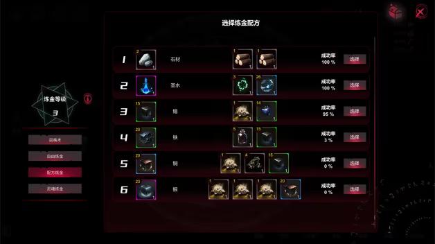 选择炼金配方后,就只能按照配方的材料配比进行炼金了。每个炼金配方都有等级,如果当前炼金等级低于炼金配方等级,成功率将会大幅下降,而进行配方炼金失败后,所有材料都会损坏。所以请努力提升炼金等级吧。