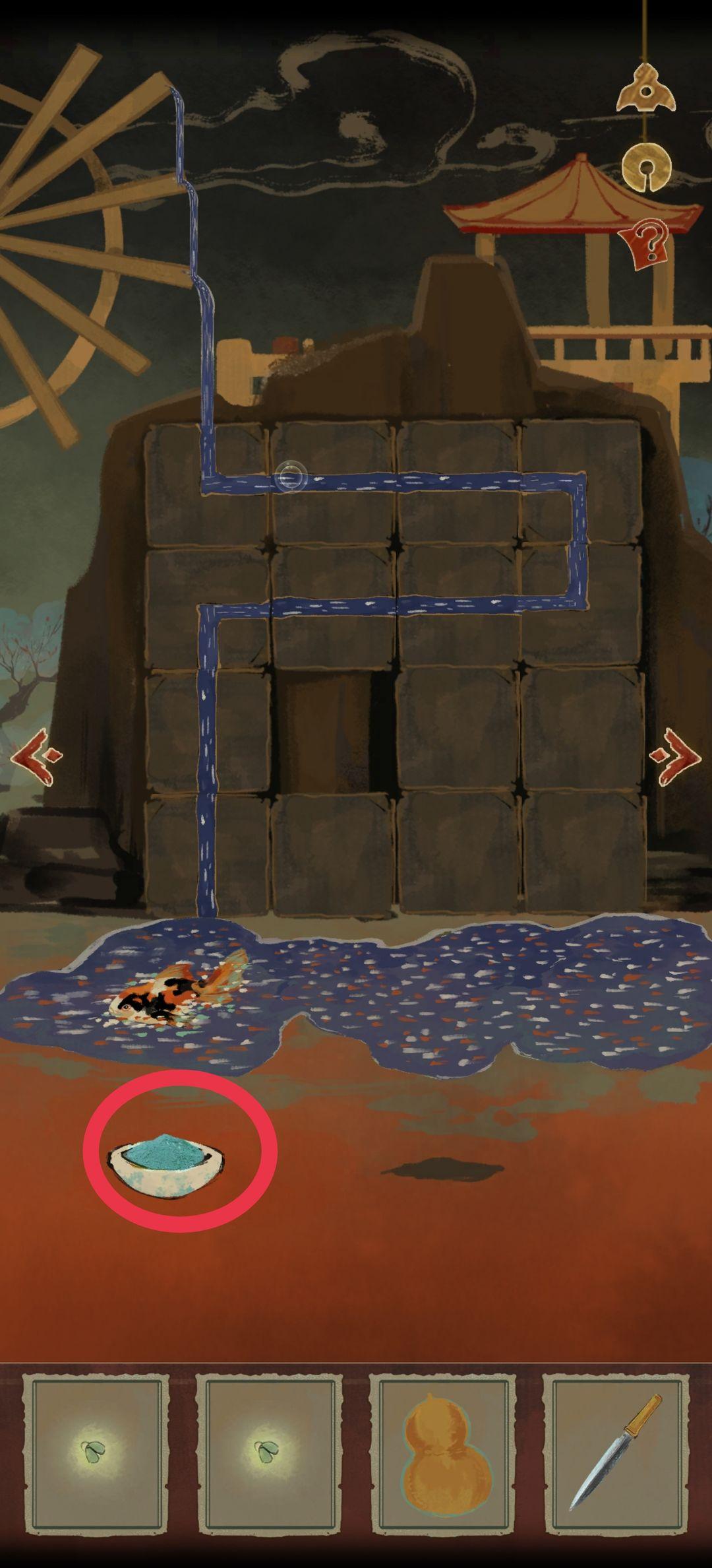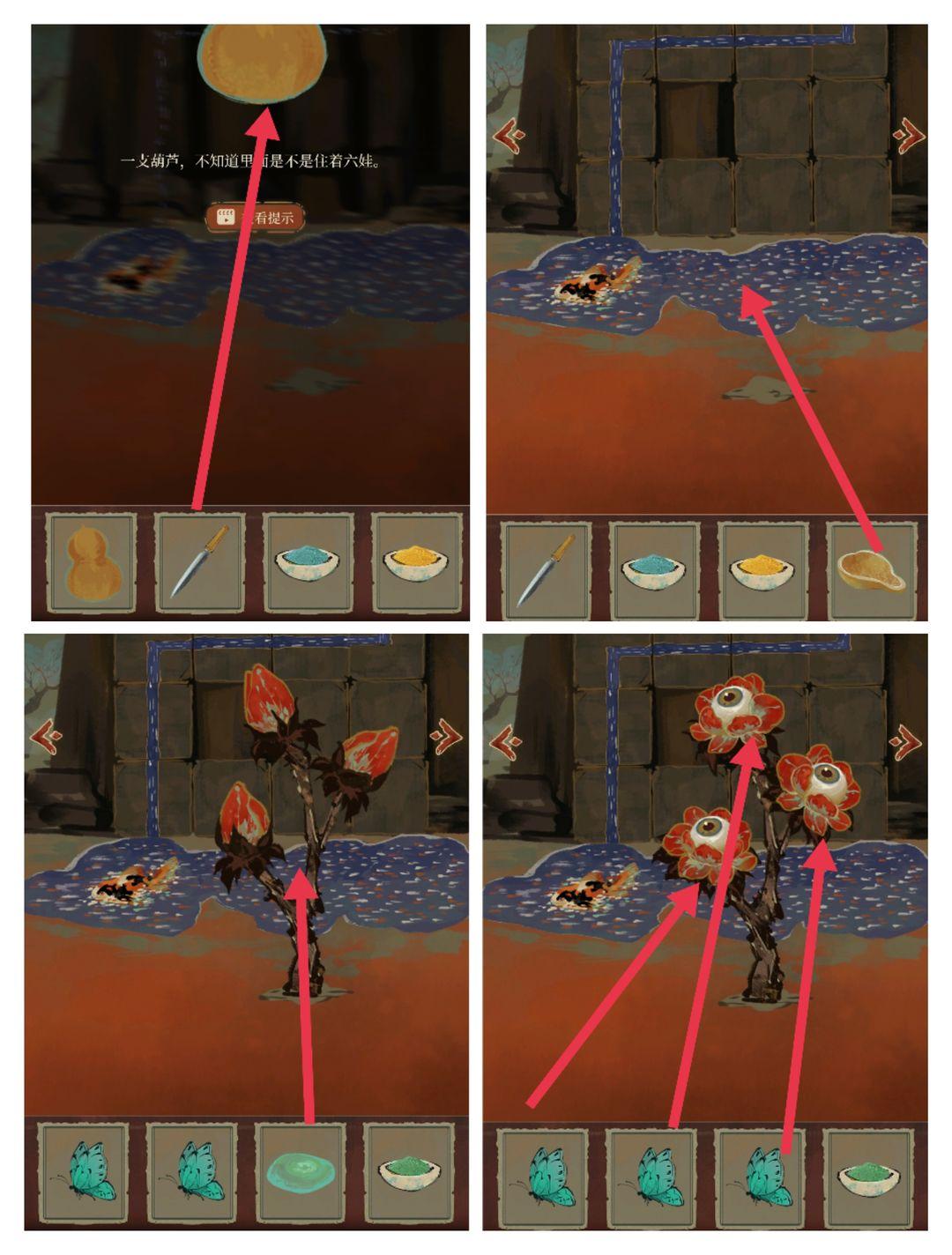 然后将种子种在拔出匕首的坑里,拿匕首把葫芦劈开,舀水,浇水,再用玉石催化一下,最后把蝴蝶放在花上传粉(?),就会飞出来一只鸟把鱼带走,最后留下一个盒子