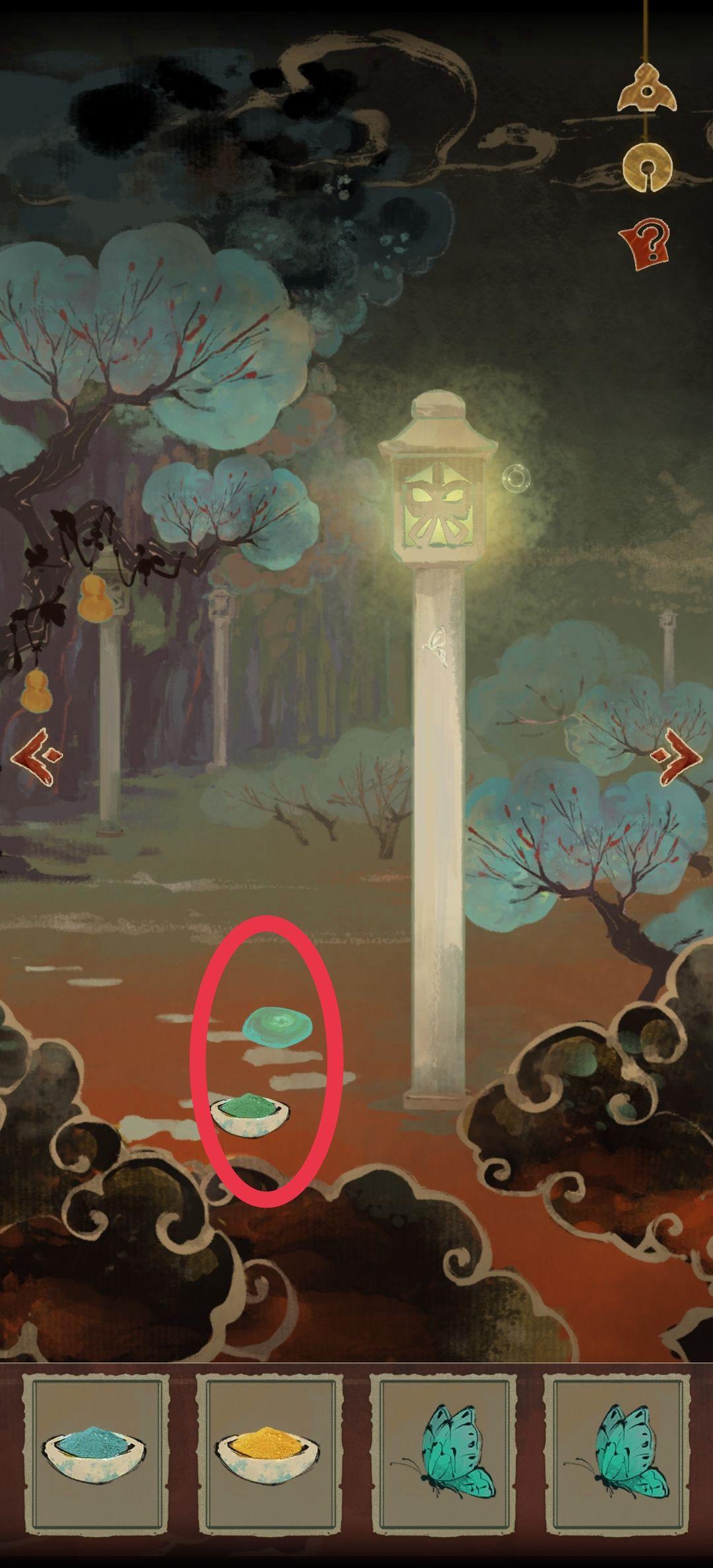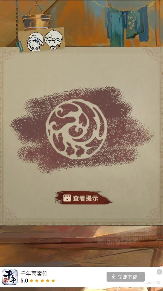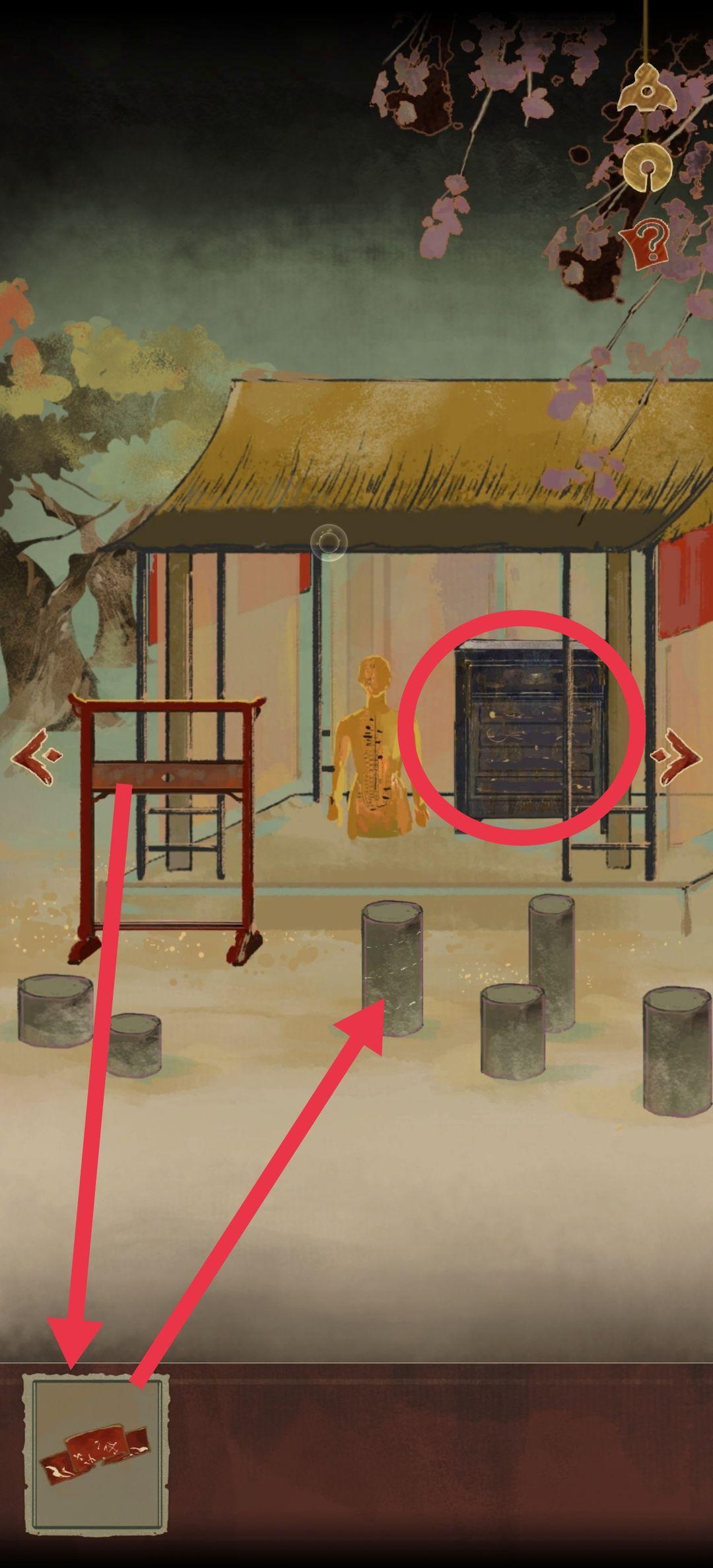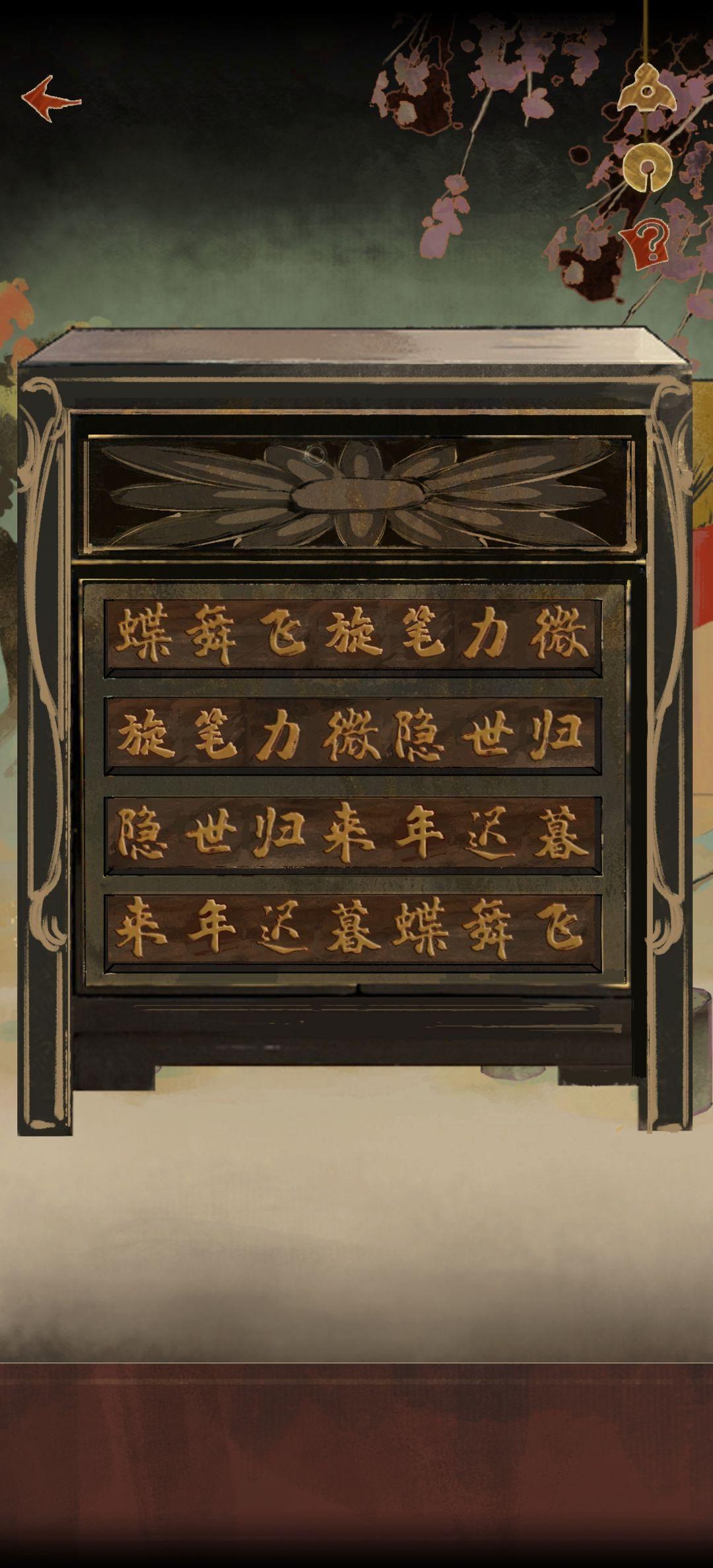 然后任劳任怨去找糖画(这里可以把左边的绸带拿了,看到柱子上有点白色痕迹,缠上去)糖画在右边圈起来的柜子里,这个谜题有点难搞,大概是个回文诗(?)反正跟着语感试出来的,不知道是不是我漏了提示