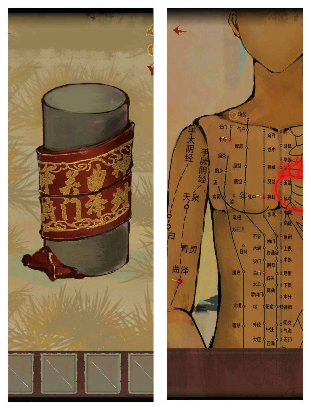 打开针灸盒,根据之前缠在柱子上的布条得到四个穴位,扎针,把木心交给女孩,听个故事,要木心开花,去字墙找“感”,扔井里,木心开花得到真心,发现是俩双胞胎女孩。