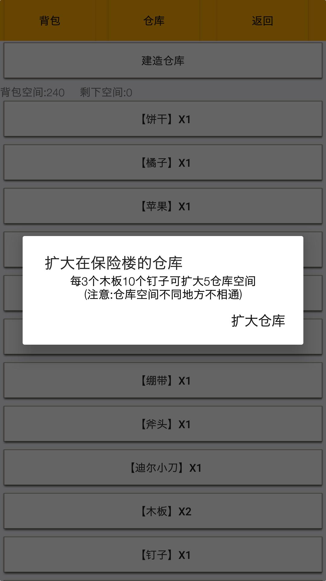 进入天赋选择,选择饥饿口渴或者背包空间,然后开始游戏,直接搜索物质,然后找到桌椅就用武器砍成木板,然后去仓库,用这些木板扩大仓库空间,这样就可以增加储存空间,找到背包就拿背包。