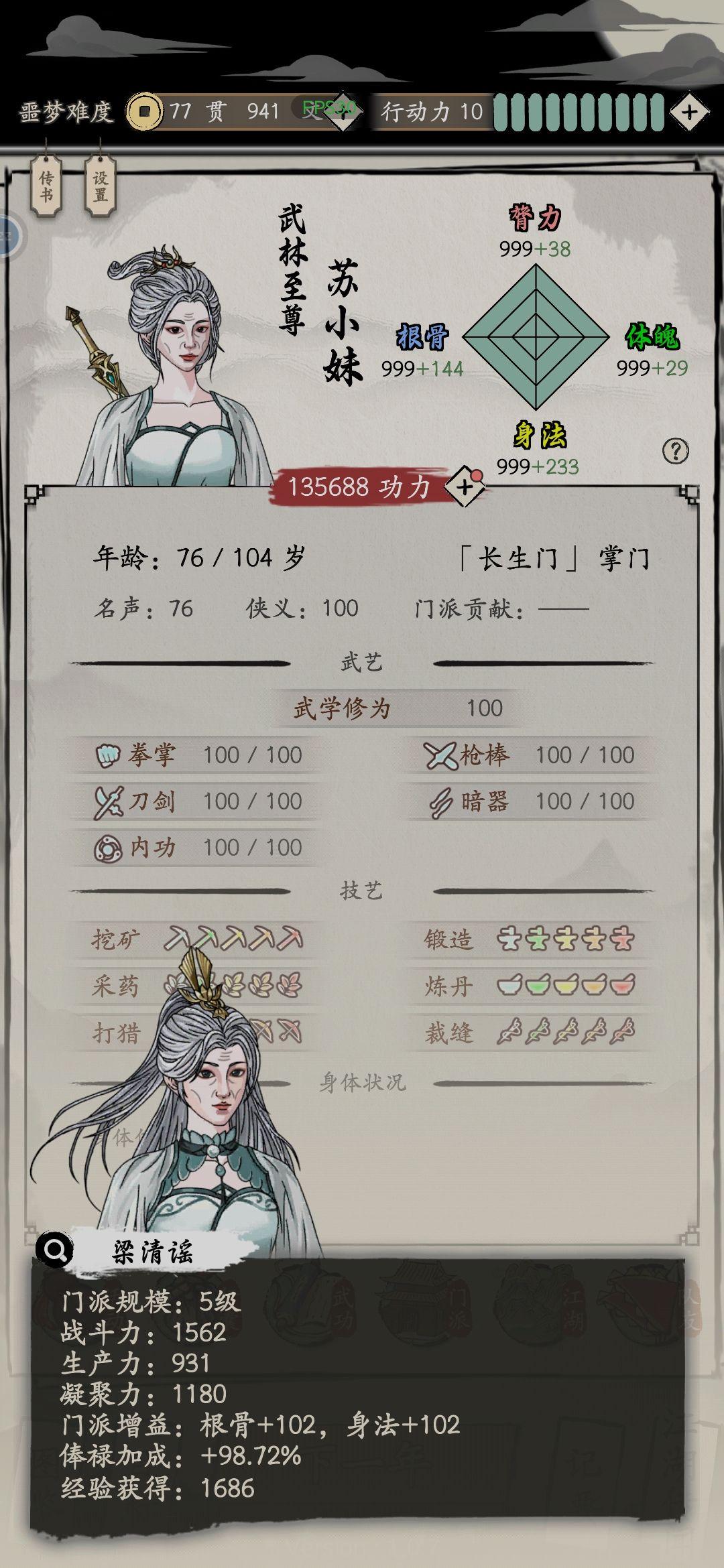 ♦本人76岁门派5级,全技艺全精通1.35万战力图: