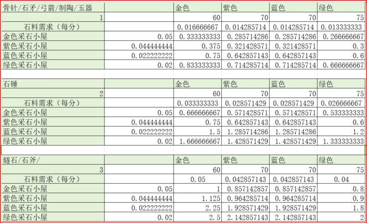 假如你有一个金色的“燧石小屋”,它每60分钟需求3个石料,那么你就需要1个金色“采石小屋”,每40分钟生产两个石料,这样长期算下来才能收支平衡。紫色采石就需要2个,蓝色和绿色需要3个。