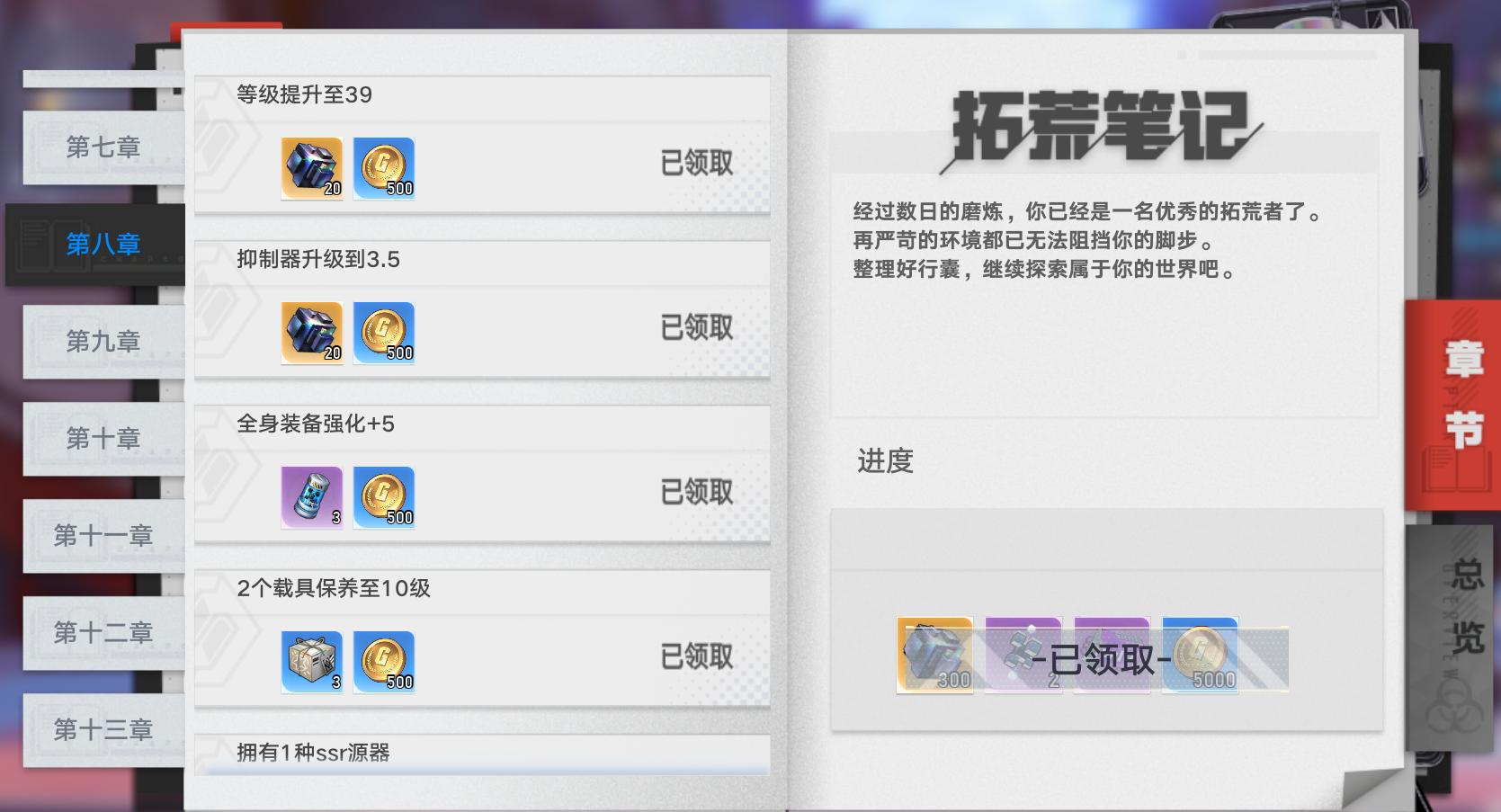 建议是先不要拿,就当做一个储蓄罐,等到全部解锁再领取,因为相较于拓荒笔记,“新手通行证”赠送的奖励在你刚开始玩时是用不到的。
