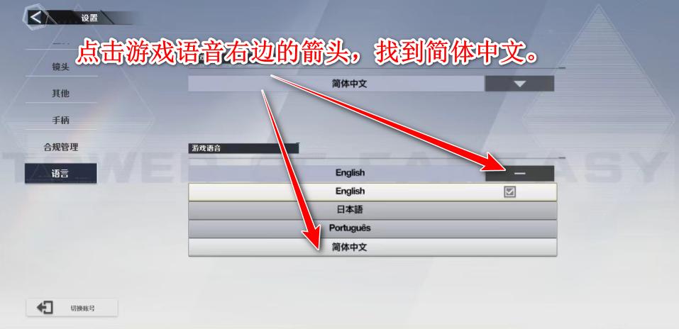 6.游戏还可以切换简体中文的语音包,点击游戏语音右边的箭头,找到简体中文。