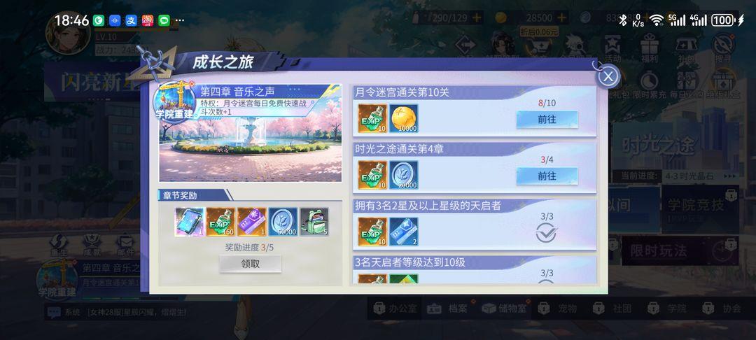 第四章音乐之声可以先做下面的任务领取SR培养起来,不要傻傻地跟着指引箭头闯月令迷宫第十关,这样就不用浪费资源培养低资质英雄了,不过培养起来也没问题,这个游戏貌似是只要投入资源,就能造福全体英雄