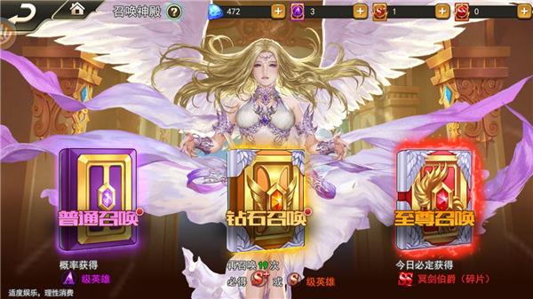可召唤出S级或S+级英雄、碎片、突破石。每天可免费抽取一次,所需的钻石英雄召唤券可通过活动掉落,或钻石进行购买。