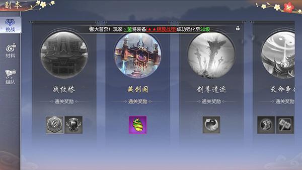 5、此外,游戏呢还有战纹塔、藏剑阁、材料等副本可以解锁挑战,通关即可获取大量资源。