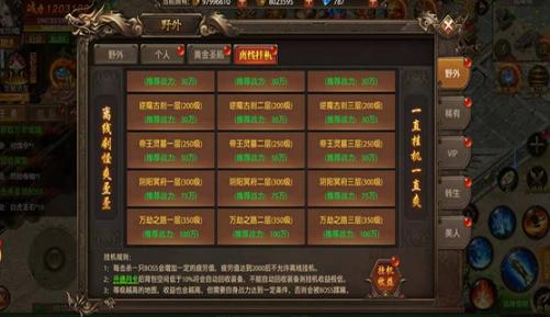 野外挂机:开服3天后开启离线挂机功能,一定要记得下线前选好挂机地图哦!除了丰厚的经验,还有大量的金币、元宝,一觉睡醒就暴富咯!