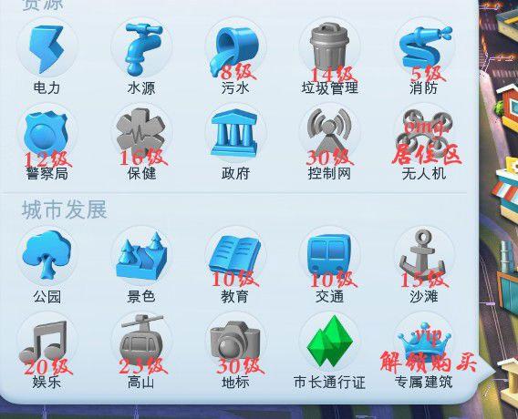 这些设施我都标记了解锁等级或者条件,水电是开局就会解锁的。