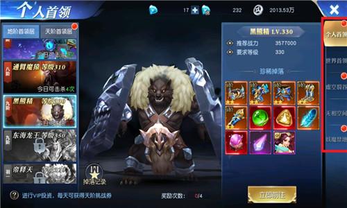 个人首领分为地阶和天阶两种模式,地阶为普通boss,天阶需要vip4以上的玩家消耗天阶挑战券才能进入,天阶boss有几率掉落稀有材料。无相空间是虚空裂谷副本的vip版本,vip4以及以上的玩家每日有六点疲劳值,其他规则均与虚空裂谷相同。无相空间是掉落攻击饰品装备的主要途径,非vip4以上玩家不可进入。