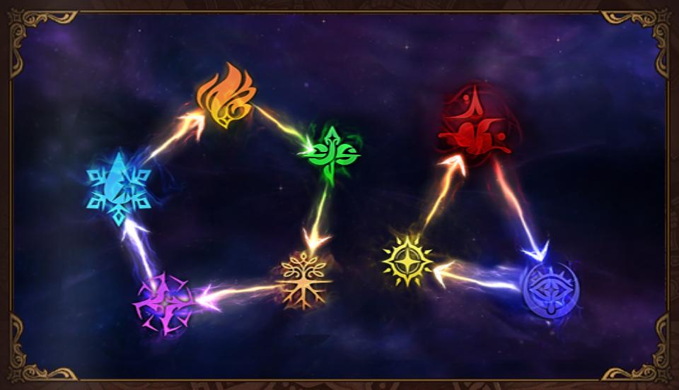 相剋屬性由兩個群組所組成,群組具備了相互循環的型態。