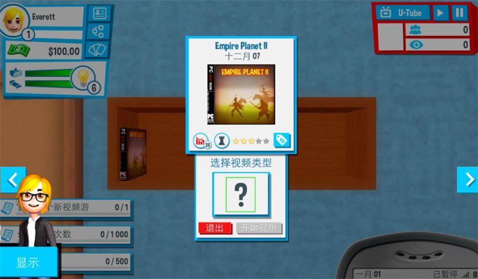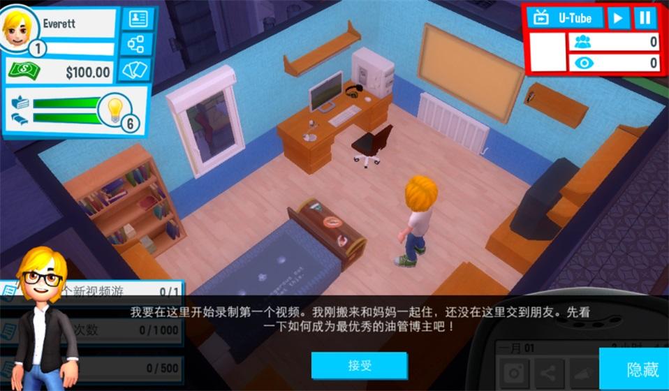 在游戏里你扮演一个梦想成为youtube网红的大学生,通过玩游戏,录制,解说,剪辑,发布视频来赚取人气和粉丝。