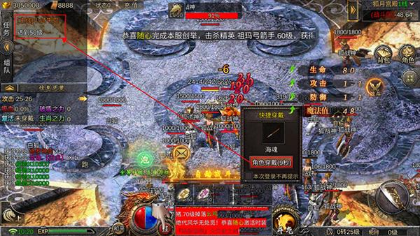 2、玩家前期可以先通过完成主线任务来获取各种资源,打怪爆出的装备点击就能一键穿戴。