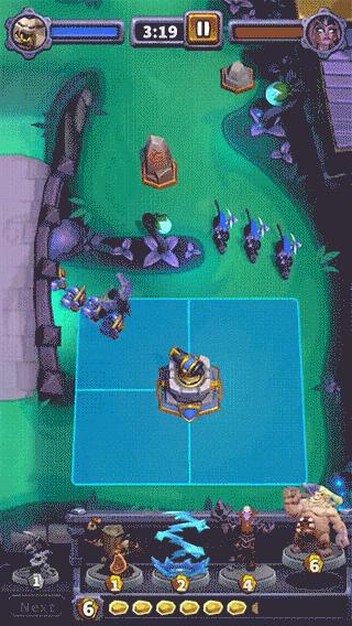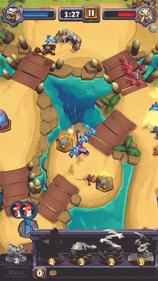 收集资源并部署单位。使用金币储备,通过策略在战场上部署。你会随着时间经过被动获得更多的金币或是通过采矿和寻找宝箱的方式来获得更多金币。