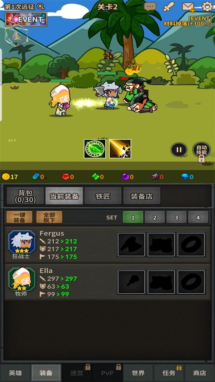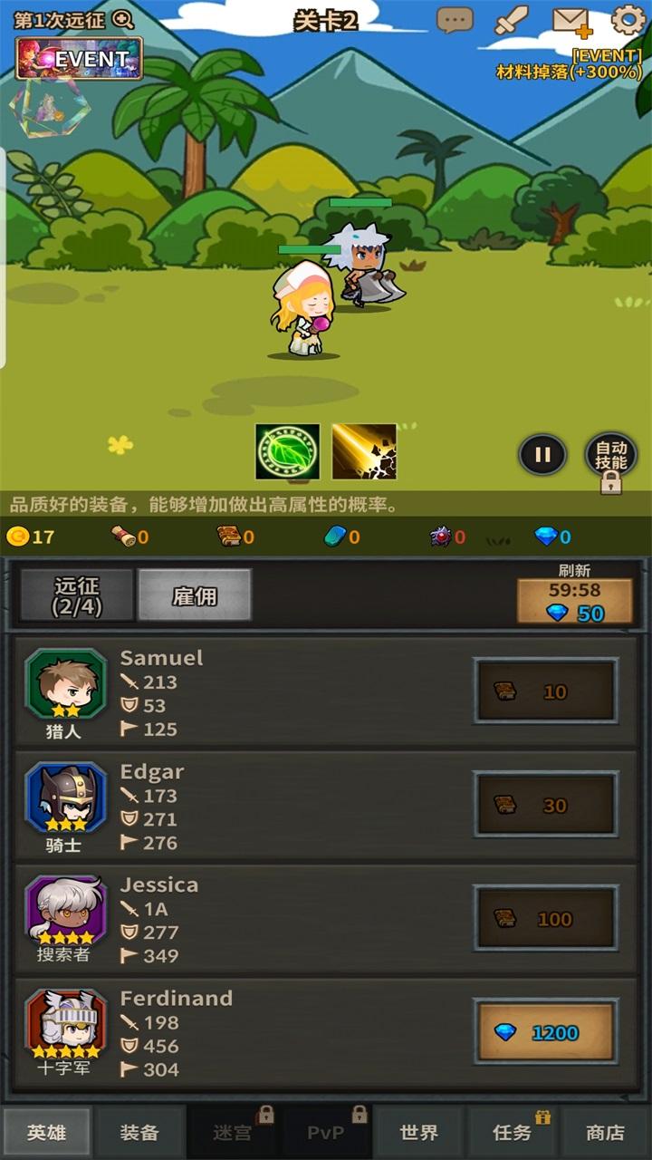 远征队是一个慢慢玩的慢热型放置游戏,所以提高效率,合理利用资源是前期快速提升的关键。前期推荐优先出掉落套装,尽量把装备掉落,金币掉落,和材料掉落提高。