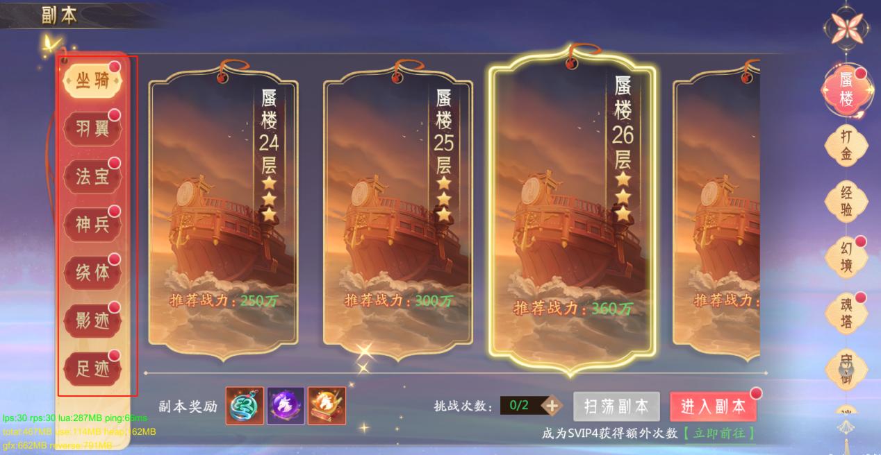 4、装备升品:装备升品要用到装备升品石,需要在幻境副本中获得。幻境副本每天都只有四次机会(VIP能够购买额外机会)这里建议大家多刷新几次,尽量能刷到三星的幻境,这样获得的升品石会比较多。