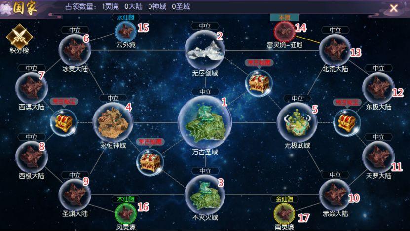 版图分为:灵境、大陆、神域、和圣域4种。冰灵大陆、圣渊大陆、北荒大陆和赤炎大陆分别代表金、木、水、火4个阵营。绿色代表自己阵营。