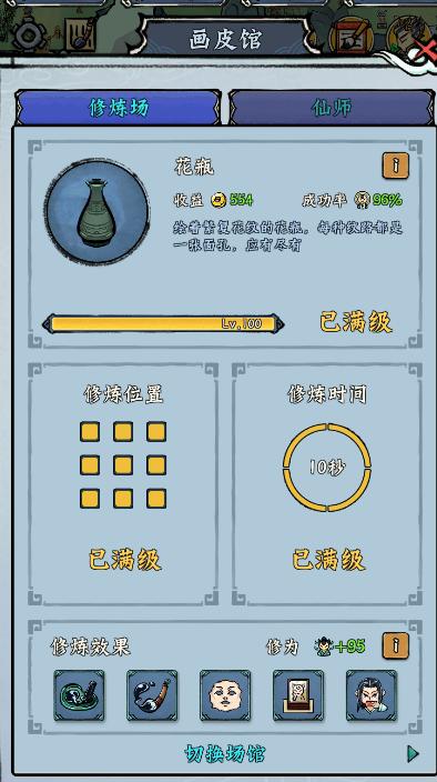 等积累了一定的铜钱之后,扫地僧的建议是先升级我们道场的位置--修炼时间-道场等级,位置增加修炼时间变短了以后收入会大大的增加(属于薄利多销?)