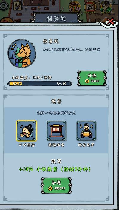 最后!大家会发现小妖们进入道场的数量不满足道场的位置时就应该去土地公公的招募处去升级一下啦,增加一下数量,或者选择发放通告在短时间内获得大量的小妖数量哦!