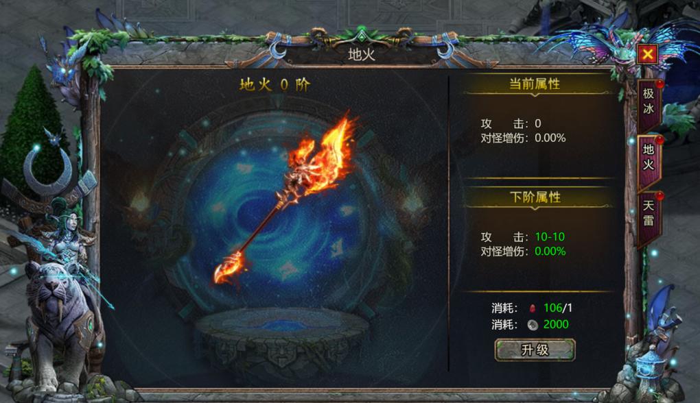 地火主打对怪增伤,消耗相应银币、红曜石升级法杖,会提高攻击、对怪增伤属性,银币可通过回收装备获得,红曜石可通过免费会员礼包、开服活动、神殿商城获取。