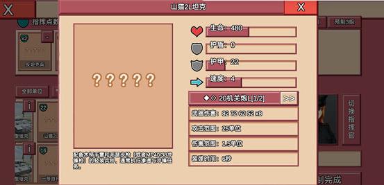 详细:在同等坦克里相对较长的25单位射程,最极致的52×8爆发伤害,以及其携带的副武器机枪,让其不管面对装甲还是人海,都能有条不紊。480的血量,22的装甲,又让其能成为你最坚实的屏障,虽然价格较为昂贵,但他值得
