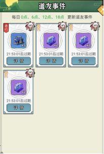 1:每天0、6、12、18点进行刷新,道友事件分为邀约、委托、交易。邀约事件需要派遣对应要求的道友处理事件,倒计时结束后可领取奖励。委托时间需要提交要求的道具,提交后开启倒计时,倒计时结束后,可手动领取奖励。交易事件会提供打折商品可供购买,道友事件出现后停留24小时后消失
