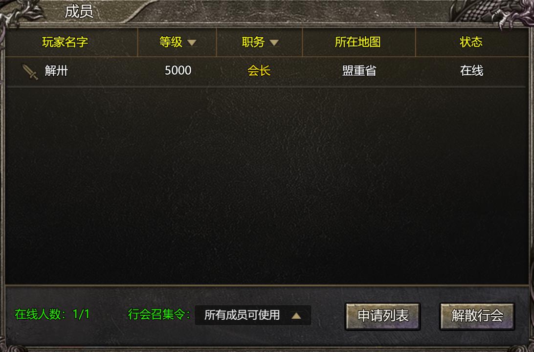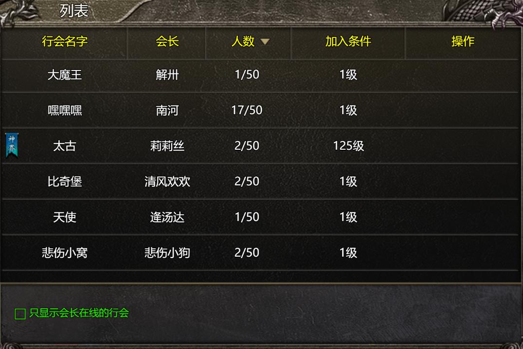最直观的显示,我们可以看到目前行会名字、会长和公告信息,在这个页面,会长可以进行行会公告的编辑。