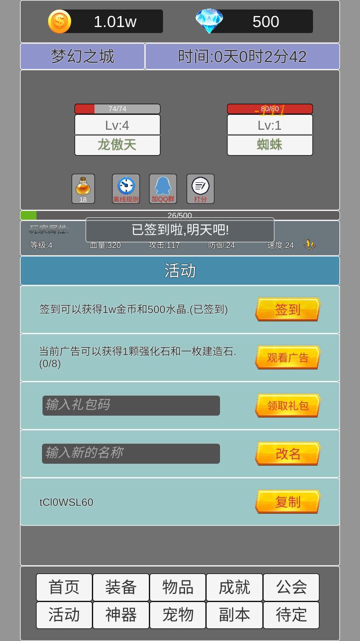 第1个板块成就,每一个怪物都是非常好打的,但是呢,药很贵,你在打第1个板块的时候。你不要兑换777这一个礼包,因为这个礼包是100药。你就穿上你打到的装备有什么穿什么,然后不停的送死,不停的去打完成成就。