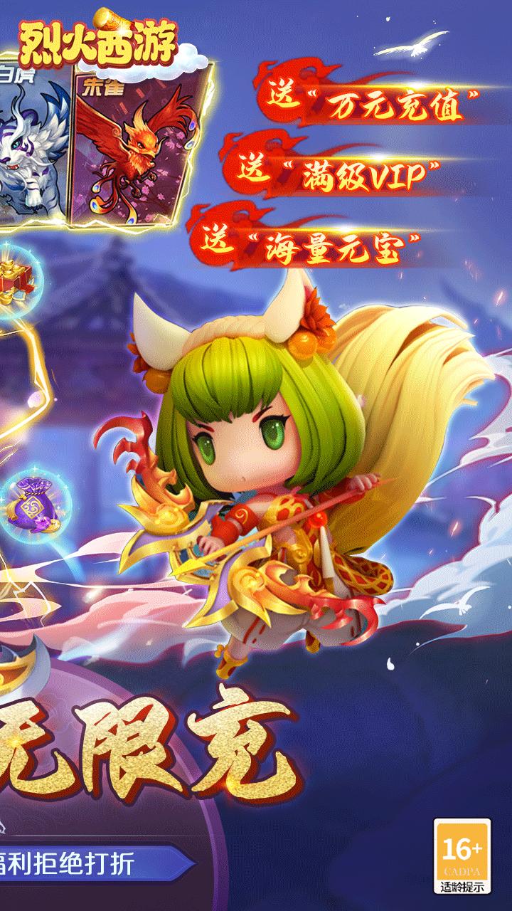 烈火西游是一款首创合成+即时的Q萌修仙游戏,以山海经神话故事为题材。在这个游戏中,所有充值都享受0.1折优惠,让您畅快享受修仙的乐趣。游戏中,您将体验到独特的合成玩法,通过合成不同的道具和装备,培养出强大的神宠,让您一直合成一直爽。烈火西游拥有细腻清新亮丽的画面,带给您特效绚丽的技能和造型多样的装备。您将与仙魔神妖展开激烈对战,穿梭在极美超仙的神话世界中。