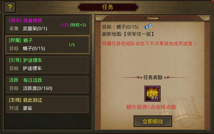 享受了王城诏令的一飞冲天之后,我们再来看看另外一项勤劳致富的经验任务,狩魔任务,每天五环,每环可获得八万经验,还能额外获得一点命格点数。