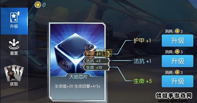 每张芯片都会有3条属性,分别由护甲、法抗、生命、攻击、冷却等组合而成。属性可以进行升级与重置:
