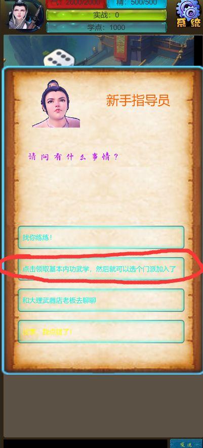 领取基本武学,接下来选择第三项做个初始任务,领取初始资源,接下来不要忘了去武道堂,实装武功