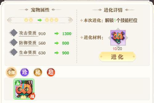当守护者获得重复宠物后,会转化为该宠物的宠物碎片,获得足够的宠物碎片后,就能够对该宠物进行进化操作。进化可以提高宠物的属性资质,从根本上提高宠物的属性上限,获得“逆天改命”的效果,珍奇宠物也能达到超稀有宠物的强度。同时,宠物进化后,还可以增加宠物的技能栏位,掌握更多战斗技巧。
