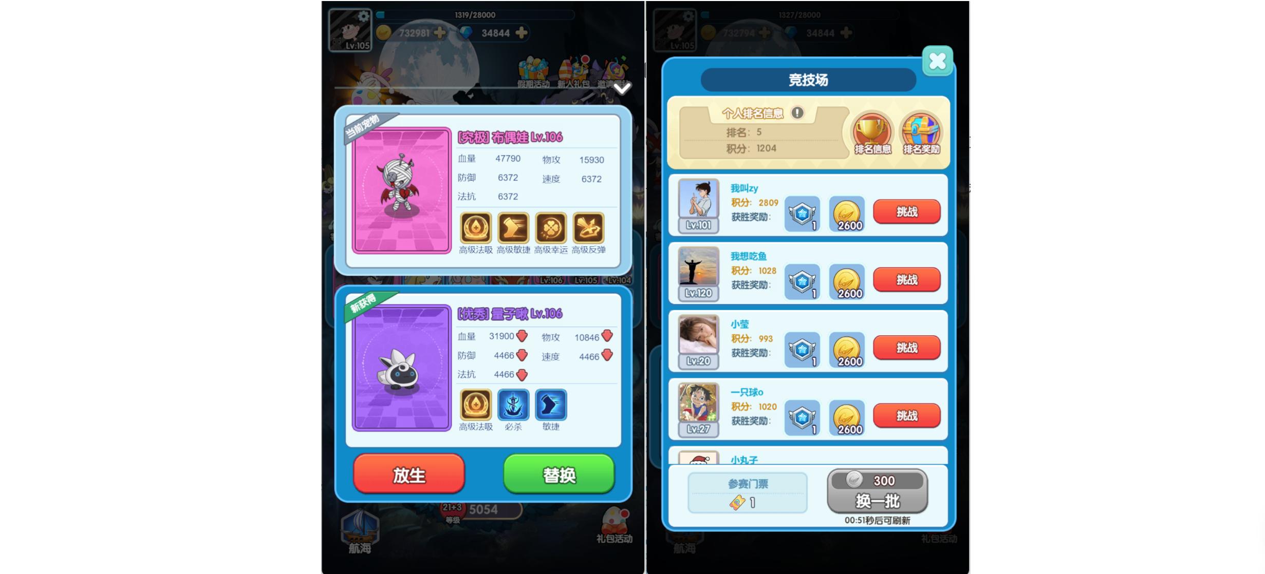 ②竞技场获胜:开蛋过程中除了可以获取金币,还会随机掉落竞技场挑战券。拿上挑战券,就可以和其它训练家进行pk!取胜后可以获得金币和积分奖励,随着积分的提高,你的对手会变得更强大,金币奖励也会更加丰厚!风浪越大~鱼越贵~想必就是这个道理了!