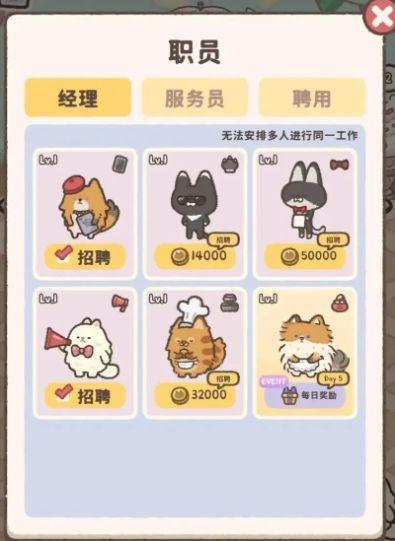 还能雇佣更多猫猫服务员帮你打理甜品店,每个猫猫都有不一样的技能!