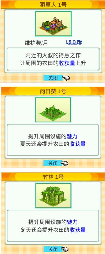 除了道具外,建设适当的环境设施也可以提高作物产量。稻草人就在提升产量上十分有效。此外,还有些环境设施会根据季节来对产量进行加成,如竹林可以提高冬天的收成、向日葵可以提高夏天的收成等等。