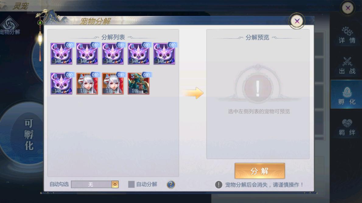3、当孵化获得宠物时,如果宠物的品质符合选中的条件,则会自动分解成宠物材料;宠物分解后会消失,请谨慎操作。