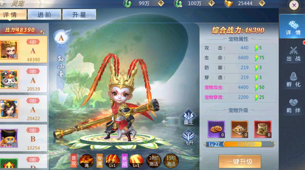 消耗对应的灵宠激活卡或宠物品质的万能星石-宠,对宠物进行升星可提高宠物的属性,带来海量战力提升!