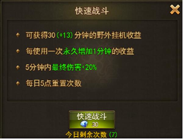 快速战斗完,千万不要闲着挂机,5分钟的伤害加成buff,赶紧进恶魔广场。2倍经验buff,鼓舞100%,刷得爽歪歪。130级会开启一个世界BOSS,也有不错的经验,能进就进。