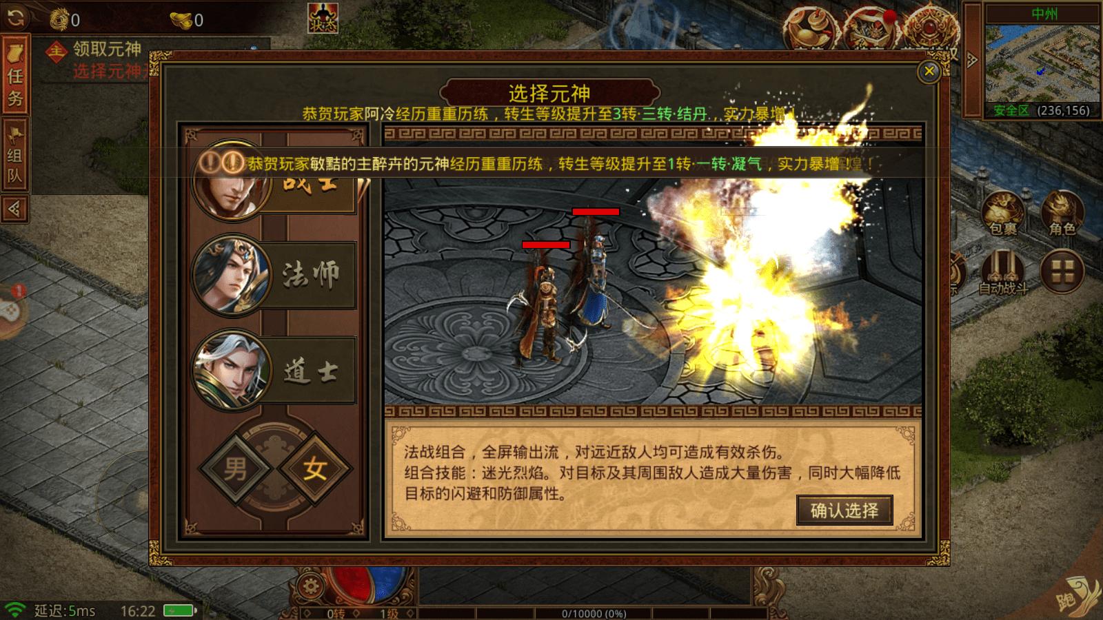 法战组合:同样也是两个高攻击输出的职业,但战士抗伤能力要比法师强很多,血比法师厚不少,但是也要注意,在混乱的人群或怪群里很容易不小心挂掉,所以战士英雄必须级别要高,否则照顾不周的话即使血再厚和抗伤能力再好,也是双拳难敌四手。装备首选魔幻+神武,有困难的话就选法神+圣战。这套组合是攻城的最佳搭档,但前提是操作要好,元神级别也要高,法战组合在攻城中有不可忽视的威力。