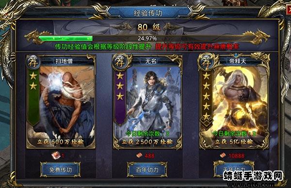 开服后第一时间进入游戏,跟着主线走,少侠可快速升到65级,并且完成至尊神兵-英雄剑任务秒得至尊神兵!获得神兵经验池,每次击杀怪物可以增加神兵经验池的经验,使用神兵精魄可以立刻提取神兵经验池的经验快速升级,立刻享有百倍经验加成特权,急速成长!(免费开放随身回收,解放背包无需回城回收,方便挂机)