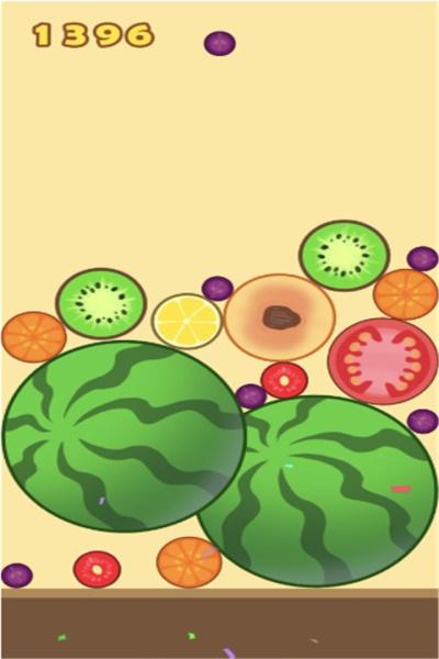 1、合成玩法大家都有玩过所以就不用多说,不过比起那种合成的只是颜色和大小上有一定变化之外,有些还是适度做出了创新——直接把水果加入进来,每次合成水果的横切面会直接被展示出来,直到最后合成西瓜的时候就是一整个立体形态,也算是游戏达到了目的,但还是可以继续合成,不过相对难度就会高很多了,因为剩余的空间无法再容纳第二个西瓜,简单来说合成第一个西瓜就代表游戏结束了一大半了,所以也算变相固定到下每局的体验时长。