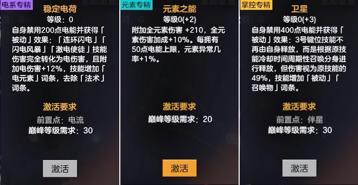你可能认为需要大代价更改BD组合才能去尝试它,但不用担心,在觉醒天赋中,我们为织星的主要技能设计了一系列电系专精的天赋——例如【稳定电荷】就能通过禁用部分电能来获得新被动效果:为技能【连环闪电】【闪电风暴】【激电使徒】去除【法术】词条,增添【电元素】词条,并让100%攻击力和其余元素伤害转化为电元素伤害。【电元素】词条的加入,不仅能充分发挥绯梦觉醒天赋的威力,也将是未来流派的可选构筑之一。