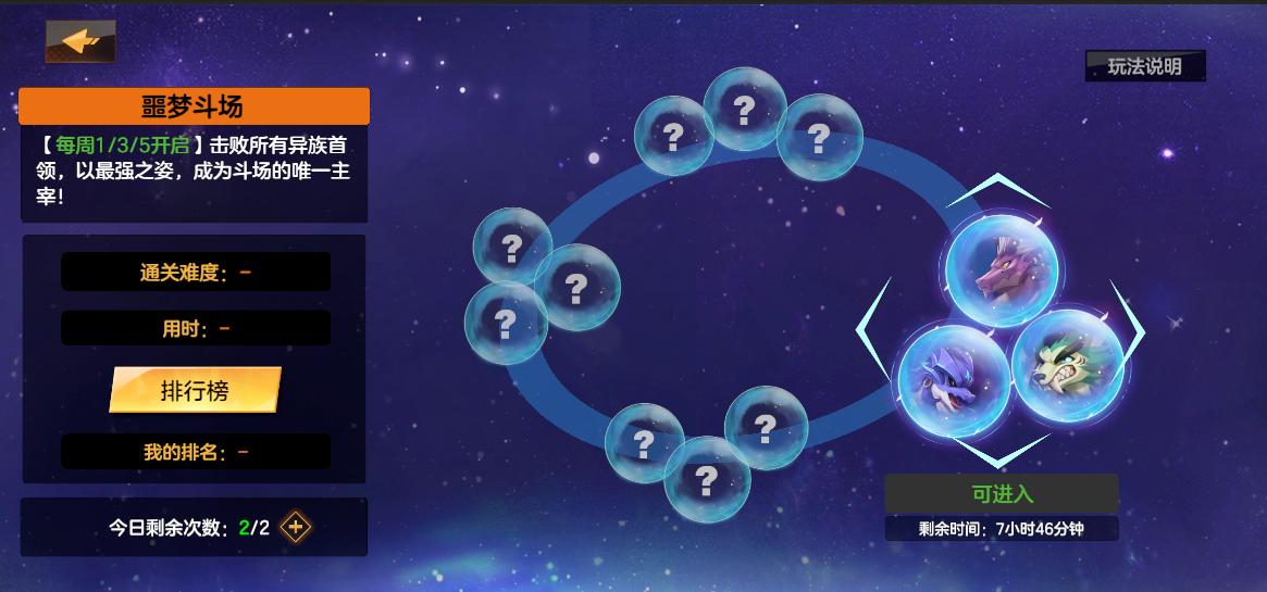 值得一提的是,噩梦斗场会记录每一位挑战者的成绩,并将其制作成排行榜来激励那些勇于挑战的勇士。噩梦斗场以七天为一周期,周期性地为排行榜上的挑战者结算奖励,而名列前茅的各位除了应得的奖励外,还将获得特殊称号。