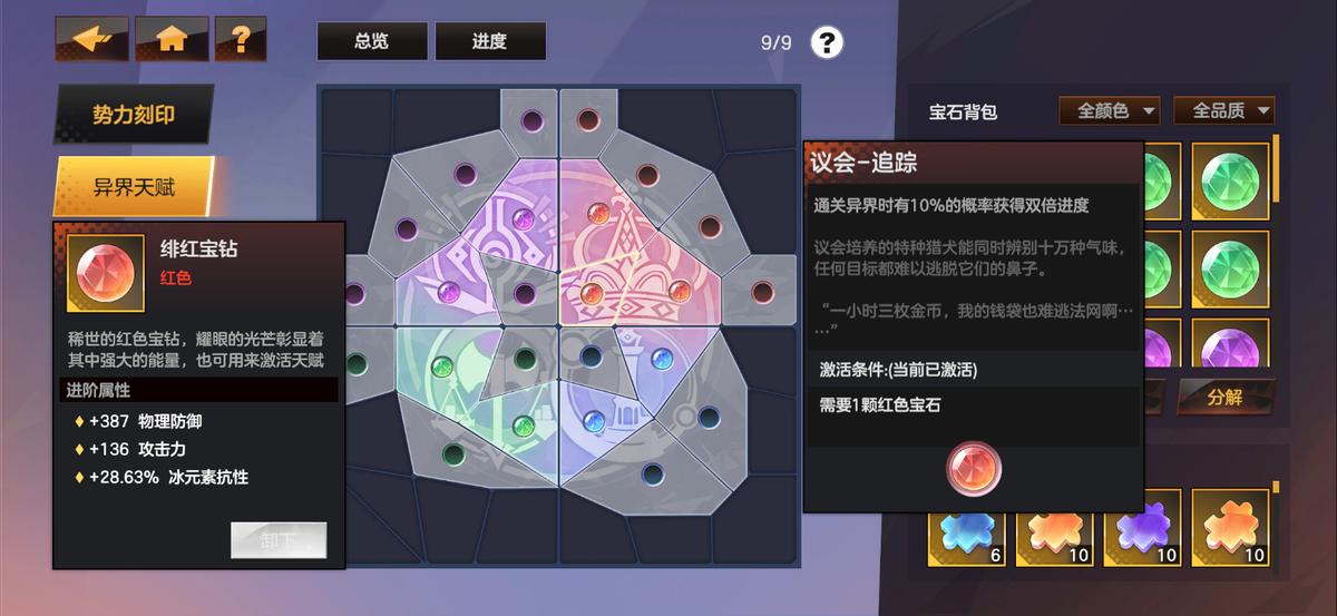 值得注意的是,各势力对于天赋宝石有些小要求,他们只接受与自己势力徽章同色的宝石,激活议会天赋需要红色宝石,占星塔天赋需要蓝色宝石,商会天赋需要绿色宝石,天陨会天赋需要紫色宝石。宝石获取不易,能够寻到合适的镶嵌孔有时也是难事。如果你获得了改色晶片等道具,那就能用来变更镶嵌孔的颜色,激活自己需要的天赋。