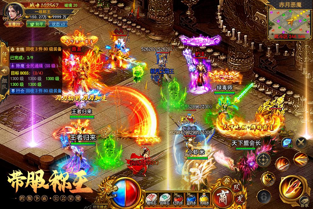 新服日日开,神装刀刀爆,越级打宝光柱满屏!公会开荒,跨服热血争霸,全新副本无限制野外PK,万人同屏狂暴刷BOSS!
