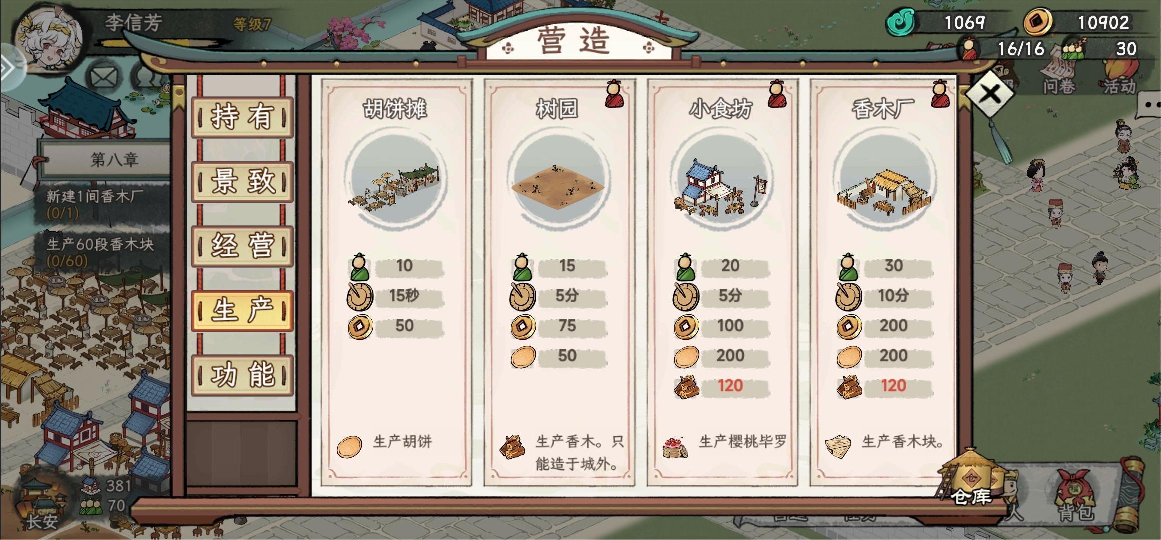 以朱雀大街为中轴线,分布着东/西市、太极宫、大明宫、兴庆宫、大雁塔等历史建筑,食肆柜坊风筝铺、水榭亭台百戏场……上百种建筑搭配繁荣度各不相同,随心建造八街九陌的盛世长安。