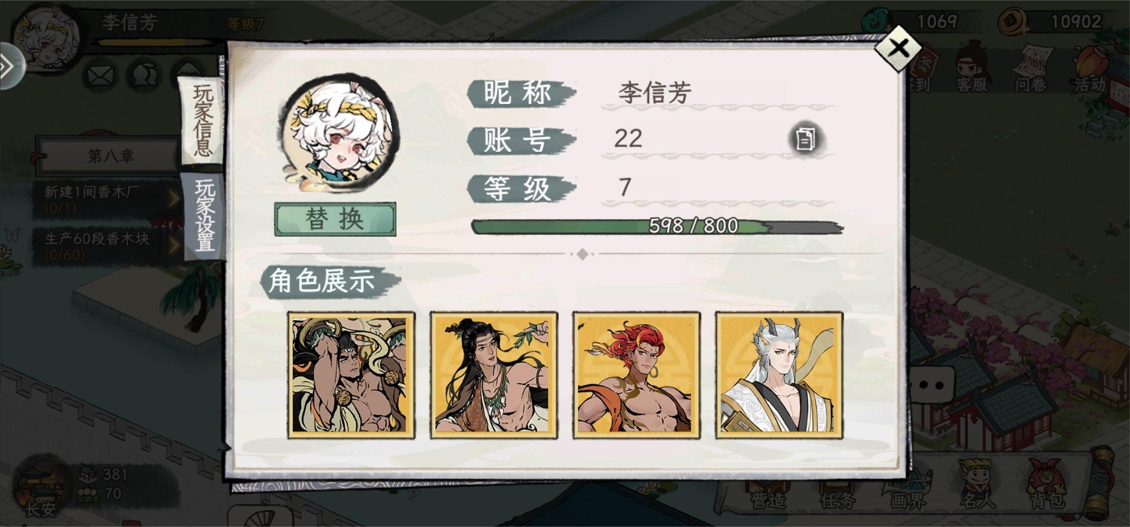 玩家信息:帐号相关的基础信息【昵称】【帐号ID】【等级】在这查看,还有【头像更换】【角色展示】功能