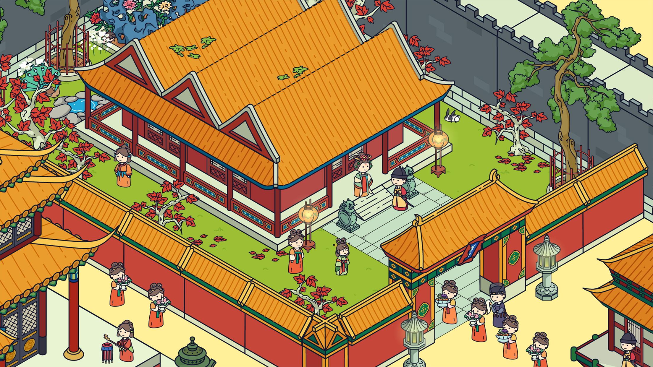 这里是千年前的神州大地,从小小的村舍出发,告别路边休憩的小狸奴;穿越竹林,伴随着潺潺溪水,你可以看到文人雅士在吟诗作对、抚琴高歌;来到赶集小镇,你可以看到珍珠翡翠、胭脂水粉、绫罗绸缎,路边的茶水摊旁还有远道而来的番邦弟兄停留歇脚;无人知晓的桃源中,生活着日出而作日入而息的居民,据说还有仙人时不时在这里停留;回到繁华都城,一年一度的上元灯会又开始了,湖边画舫阵阵笙歌,闹市里张灯结彩,城中老树挂满了美好寓意的红结。顺着绵延而去的城墙望去,番邦使者带着车队远道而来,城中恰逢一对新人喜结连理,处处锣鼓喧天好不热闹!